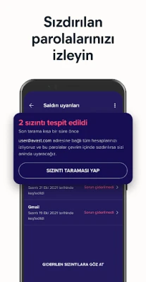 Cihazınızı kötü amaçlı yazılımlardan, casus yazılımlardan ve kimlik avı saldırılarından koruyarak verilerinizin güvende kalmasını sağlayın. Avast Mobile Security ve Antivirus'ün kapsamlı özellikleri, uygulamalardaki gizlilik risklerinden e-posta tabanlı tehditlere kadar geniş bir yelpazede savunma sunar. İnternette güvenle gezinmek, halka açık Wi-Fi ağlarında dahi bağlantınızı emniyette tutmak ve sızdırılmış parolalar hakkında anında uyarılar almak için temel güvenlik araçlarımız her zaman hizmetinizdedir.